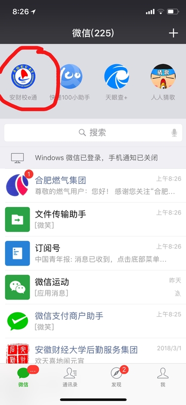 1、在微信中下拉屏幕,可以看到最近使用的小程序“安财校e通”直接进入。