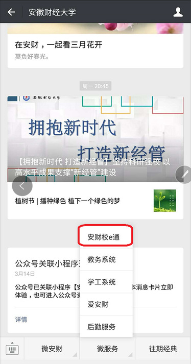 1、关注“安徽财经大学”、“青春安财”、“安徽财经大学后勤服务集团”、“安徽财经大学图书与信息中心”等微信公众号,点击菜单按钮进入“安财校e通”。