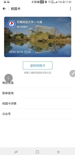安徽财经大学校园一卡通目前已为全体师生员工开通支付宝、微信、农业银行充值服务,虚拟校园卡主要通过微信小程序实现,用户无需安装任何程序,通过微信即可实现一卡通主要业务功能,师生员工无需实体卡,通过扫码即可完成身份认证和支付功能,目前已经在东校图书与信息中心(图书馆)门禁、东西校超市开展试用,未来可能扩展到食堂、学生宿舍门禁、开放实验室、校医院、多媒体教室等场所,虚拟校园卡将为全体师生员工提供更便捷的服务。