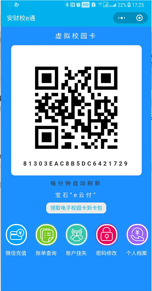 虚拟校园卡在在现有一卡通系统上的移动互联联网的服务延伸,是现有校园卡的二维码电子形态,提供基于移动端的一卡通服务。电子校园卡与实体校园卡完全绑定身份及余额完全共享。
