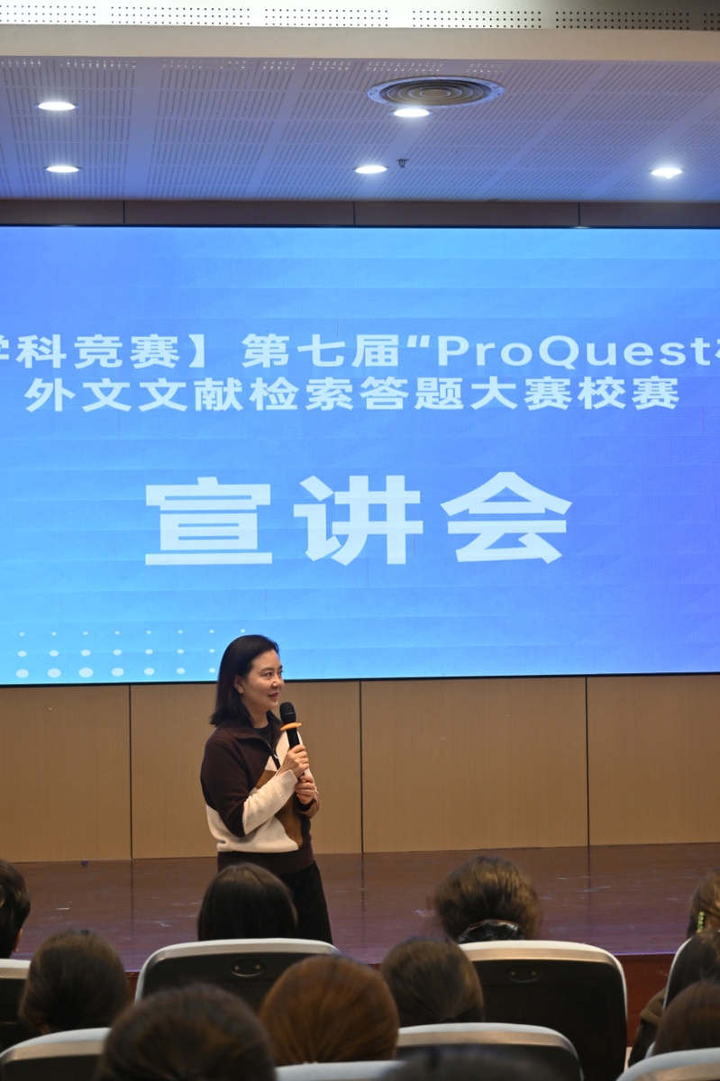 提升本校学子的文献检索与运用能力,助力参赛同学全面知悉比赛信息,由图信中心主办、赛事组委会承办的第七届“ProQuest杯”外文文献检索答题大赛校赛(含省赛)宣讲会,于2025年11月5日15:30至16:30,在东校区图书馆一楼学术报告厅举行。约一百余名同学参与了此次宣讲会。